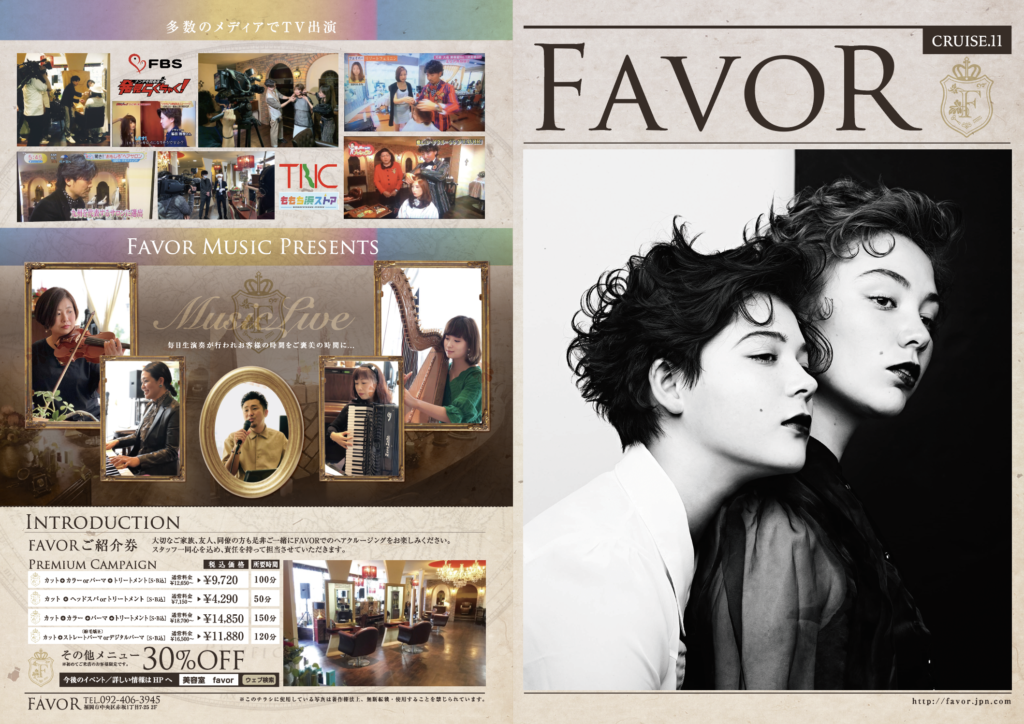 アンティーク調の店内で生演奏を聴きながらヘアカットをする美容室FAVORの雰囲気をそのまま感じられるよう、紙面にもアンティークな装飾を散りばめ、作品一つひとつをじっくりと見られるようレイアウトにも工夫を凝らしたデザイン。
