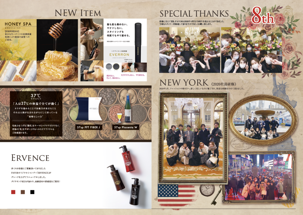 アンティーク調の店内で生演奏を聴きながらヘアカットをする美容室FAVORの雰囲気をそのまま感じられるよう、紙面にもアンティークな装飾を散りばめ、作品一つひとつをじっくりと見られるようレイアウトにも工夫を凝らしたデザイン。